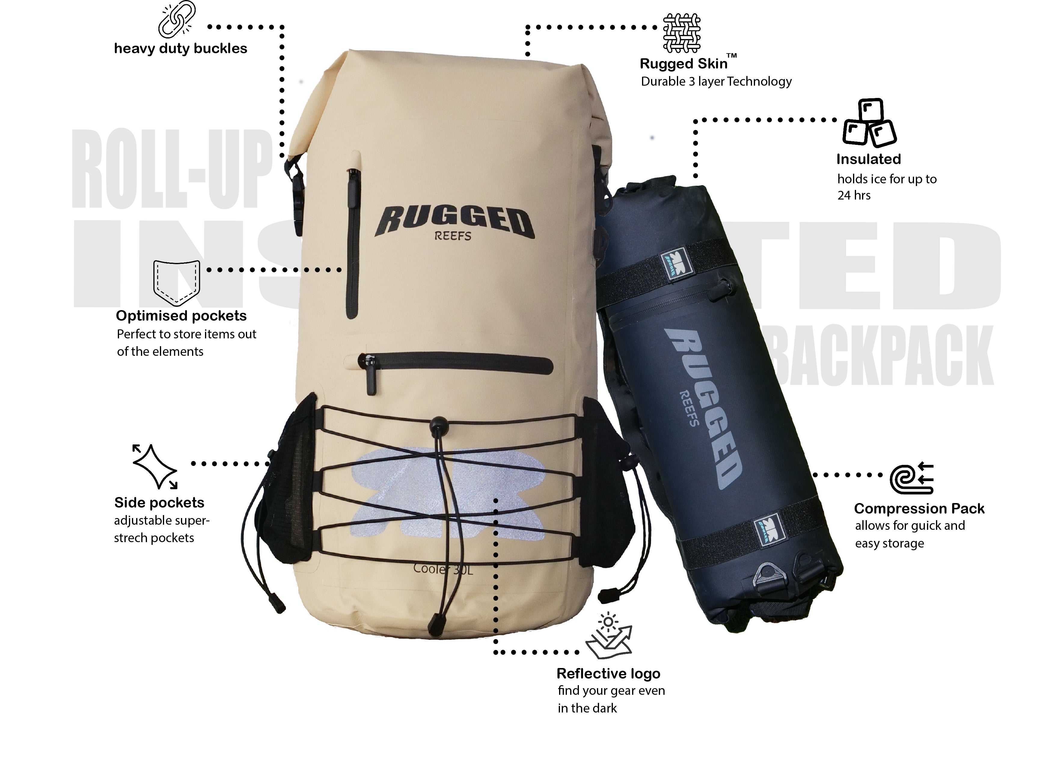 Rugged Reefs compress pack technology allows you to have the luxury of keeping beers or food cold all day, While rolling up for simple and convenient storage when its time to pack away!